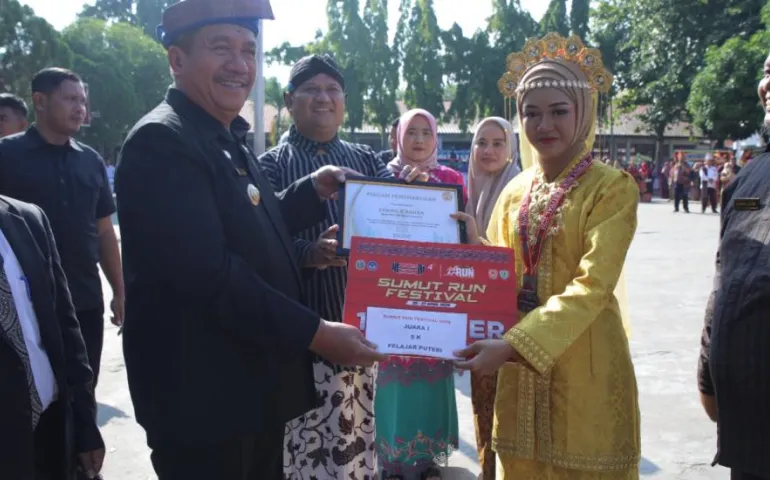 Bupati dan Wakil Bupati Asahan menyerahkan souvenir dan buku rekening Program Indonesia Pintar (PIP) kepada 75 siswa. Selain itu, Bupati juga menyerahkan piagam penghargaan kepada peserta pelajar putri juara 1 Run 5K Sumut Run Festival 2025. (Satya Dharmawan)