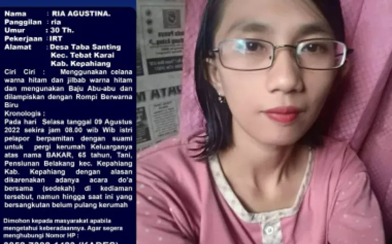 Kepahiang,SiberSpace.id - Informasi orang hilang diterima Sentra Pelayanan Kepolisian Terpadu (SPKT) Polres Kepahiang beberapa waktu lalu. Ria Agustina (30) Ibu Rumah Tangga warga Desa Taba Santing, Kecamatan Tebat Karai, Kabupaten Kepahiang dilaporkan pihak keluarga belum kembali ke rumah sejak tiga hari lalu.