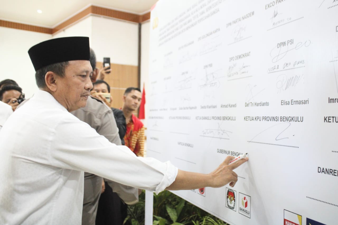 Pengucapan Deklarasi Pemilu Damai dipimpin Ketua Bawaslu Provinsi Bengkulu dan dilanjutkan Penandatanganan Deklarasi Pemilu Damai yang ditandatangani seluruh Partai Politik peserta Pemilu, calon DPD RI, FKUB serta Kapolda dan Sekda Provinsi Bengkulu dan Unsur Forkopinda.