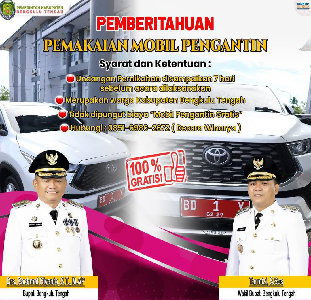 Bengkulu Tengah, Siberspace.id -- Warga Kabupaten Bengkulu Tengah kini bisa merasakan pelayanan unik dan penuh perhatian dari pemerintah daerah. Dalam program 100 hari kerjanya, Bupati Bengkulu Tengah, Drs. Rachmat Riyanto, ST., M.AP., meluncurkan inisiatif istimewa: mobil dinas bupati kini bisa digunakan sebagai mobil pengantin secara gratis oleh warganya yang akan melangsungkan pernikahan.