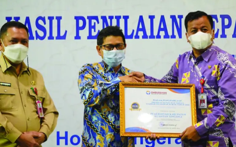 " Alhamdulillah, Pemerintah Kabupaten Kuantan Singingi mendapatkan peringkat ketiga atas penilaian Ombudsman RI untuk kategori Kepatuhan Standar Pelayanan Publik Tahun 2021", terangnya