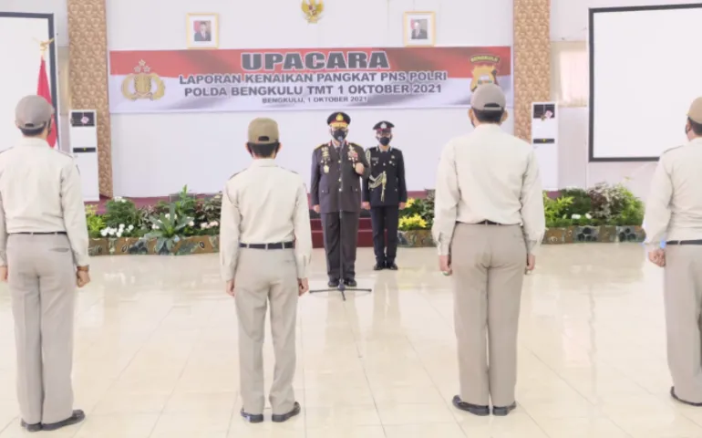 Kenaikan pangkat PNS polri Bengkulu TMT 1 tersebut ditandai dengan upacara kenaikan pangkat yang dilaksanakan pada Jumat pagi (01/10/21) yang dipimpin langsung oleh Kapolda Bengkulu Irjen pol Drs.Guntur Setyanto M.Si .