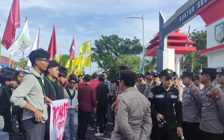 Puluhan aparat kepolisian tampak berjaga ketat di pintu gerbang utama, menghadang upaya mahasiswa yang sempat mengancam akan menerobos masuk jika tuntutan mereka diabaikan. Sejumlah orator mahasiswa secara bergantian menyuarakan keluh kesah dan tuntutan melalui pengeras suara.
